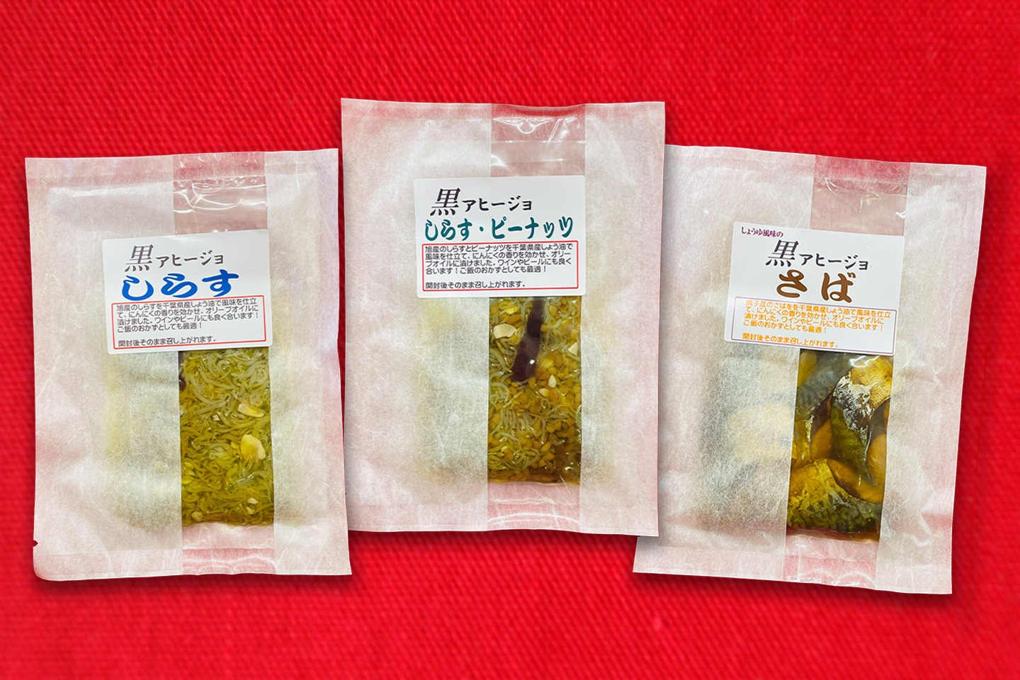 旭産のしらすとピーナッツを千葉県産しょう油で風味を仕立て、にんにくの香りを効かせ、オリーブオイルに漬けました。ワインやビールにも良く合います!ご飯のおかずとしても最適!